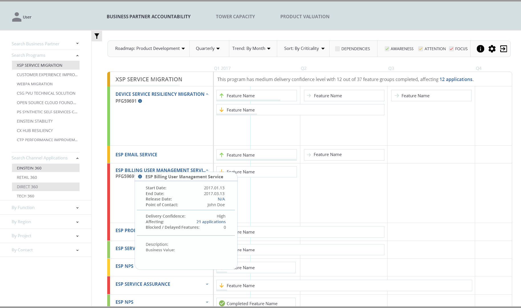 The MVP was a BI dashboard that empowers managers and team leads to have strategy and prioritization conversations with business partners and internal team members by presenting prospective views of business and technical data in an integrated, accurate, relational, insightful, easily consumable, and actionable way. I was hired as a UX consultant by a design consultancy, as part of a remote engineering team, to contribute to the development of a business intelligence tool for a large US telecommunications conglomerate that was going through an organizational transformation as part of a merger at the time. The tool's business outcome would be rebranding and repositioning of the client's department as a product and value center in the company.